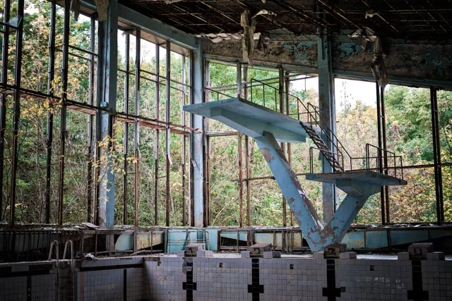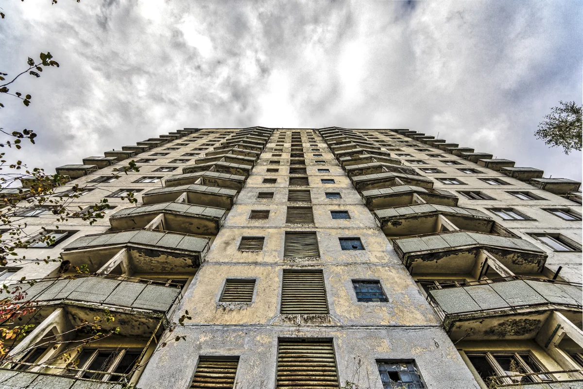 De eerste stop is bij een van de hoogste appartementencomplexen van de stad. Het is tegenwoordig niet meer veilig om panden te betreden en het is dan ook, zelfs hier, verboden om deze te betreden. De bus wordt verstopt tussen de struiken, en we duiken het complex in. Het is geen kwestie van de lift pakken naar de 16e verdieping. Het is dus klimmen, en dat is met een cameratas op je rug en een statief op je schouder best een hele klus! Maar eenmaal aangekomen op het dak is het zicht adembenemend. Aan de ene kant uitzicht richting de kerncentrale en de stad en achter je, kijk je naar het Rode Bos. De naam verwijst naar de roodbruine kleur die de dennenbomen kregen door de kernramp in 1986. Dit is veroorzaakt doordat de bomen massaal afstierven door de straling. De bomen werden na de kernramp geruimd en begraven. Sindsdien zijn er weer nieuwe bomen gegroeid. Maar de straling is in dat bos nog ruim aanwezig.